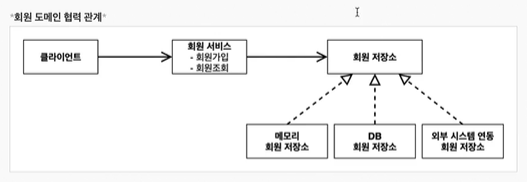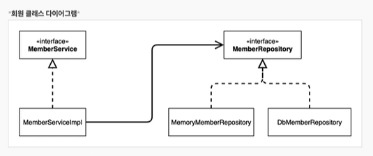 - 클라이언트 → 서비스 → 인터페이스 ← 구현체