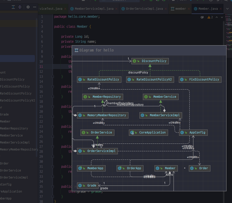 위에서 추가한 할인 정책을 적용 해보자. 할인 정책을 변경하려면 클라이언트인 OrderServiceImpl 코드를 수정해야 한다. 즉, DIP 원칙을 위배하는 소스라는 점이다.