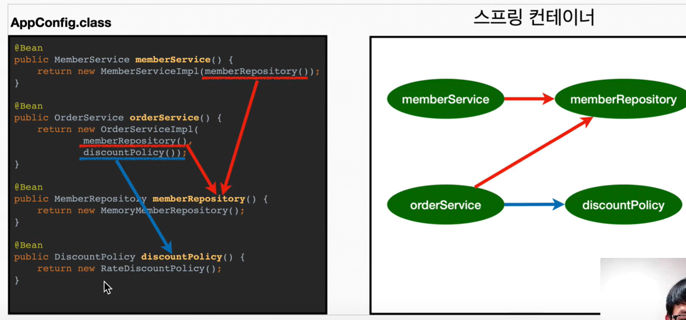- 애플리케이션을 하나의 공연이라고 생각 해보자. 각각의 인터페이스(MemberService, DiscountPolicy)를 배역(배우 역할)이라고 생각하자. 그런데! 실제 배역에 맞는 배우를 선택하는 것은 누구인가? → 배우가 선택하지 않고, 공연 기획자(감독)이 배역의 배우 선택
