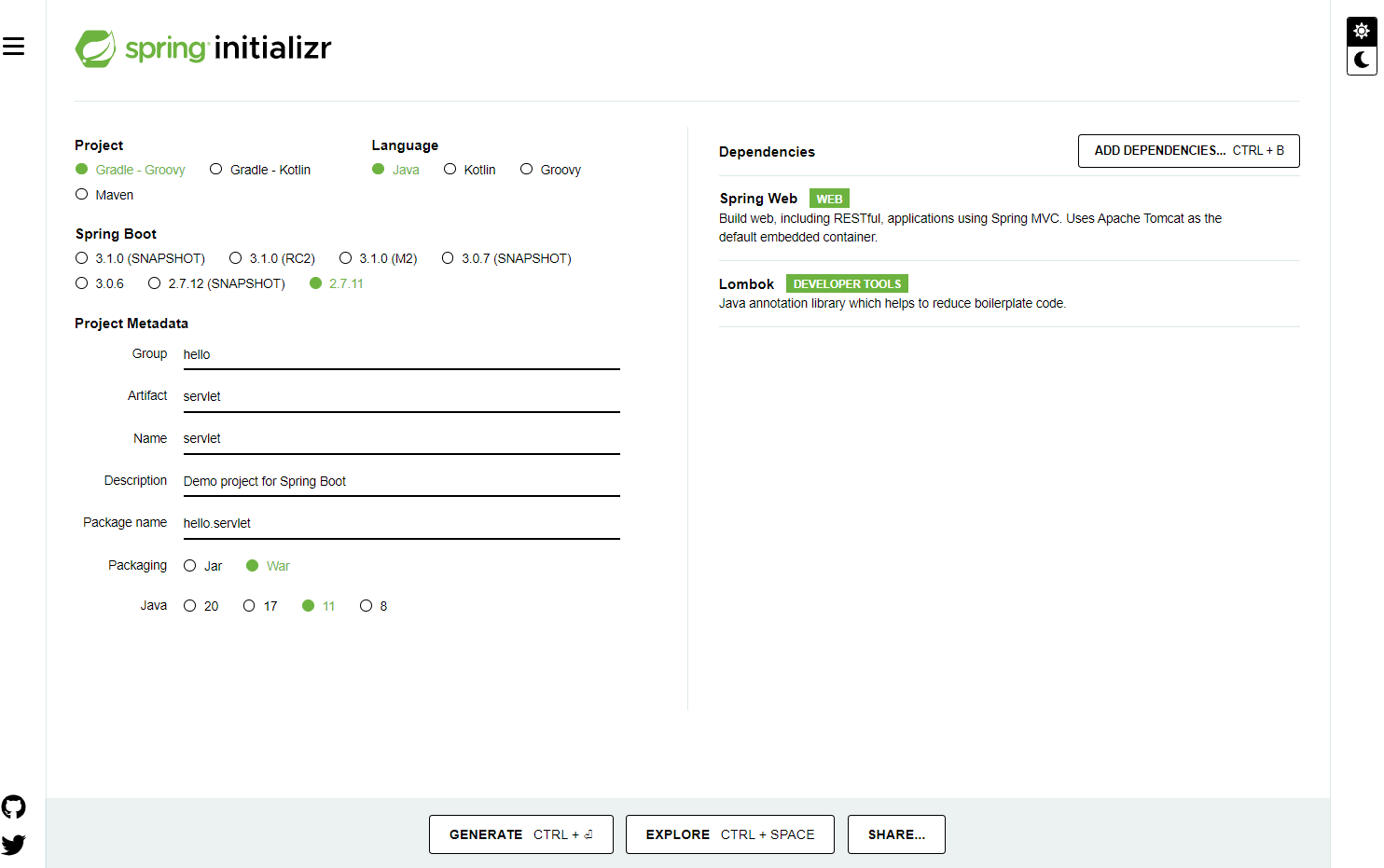 - 스프링 MVC 환경을 구성하기 위해 프로젝트 생성