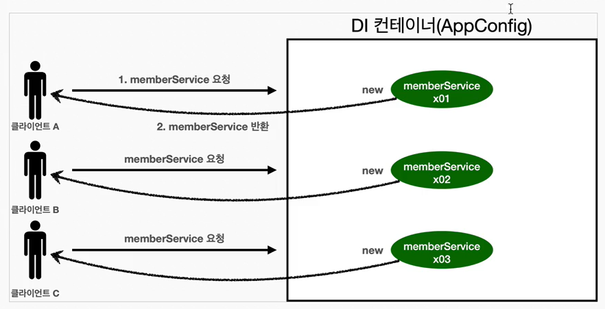 - 이전에 만든 순수 DI 컨테이너 AppConfig는 요청을 할 때마다 객체를 새로 생성한다