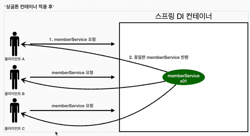 - 스프링 컨테이너는 싱글톤 컨테이너 역할을 수행