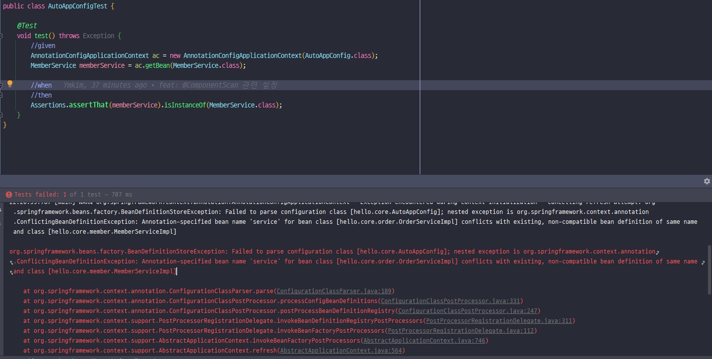 - 이 때 이름이 같은 경우 스프링은 오류를 발생 시킴