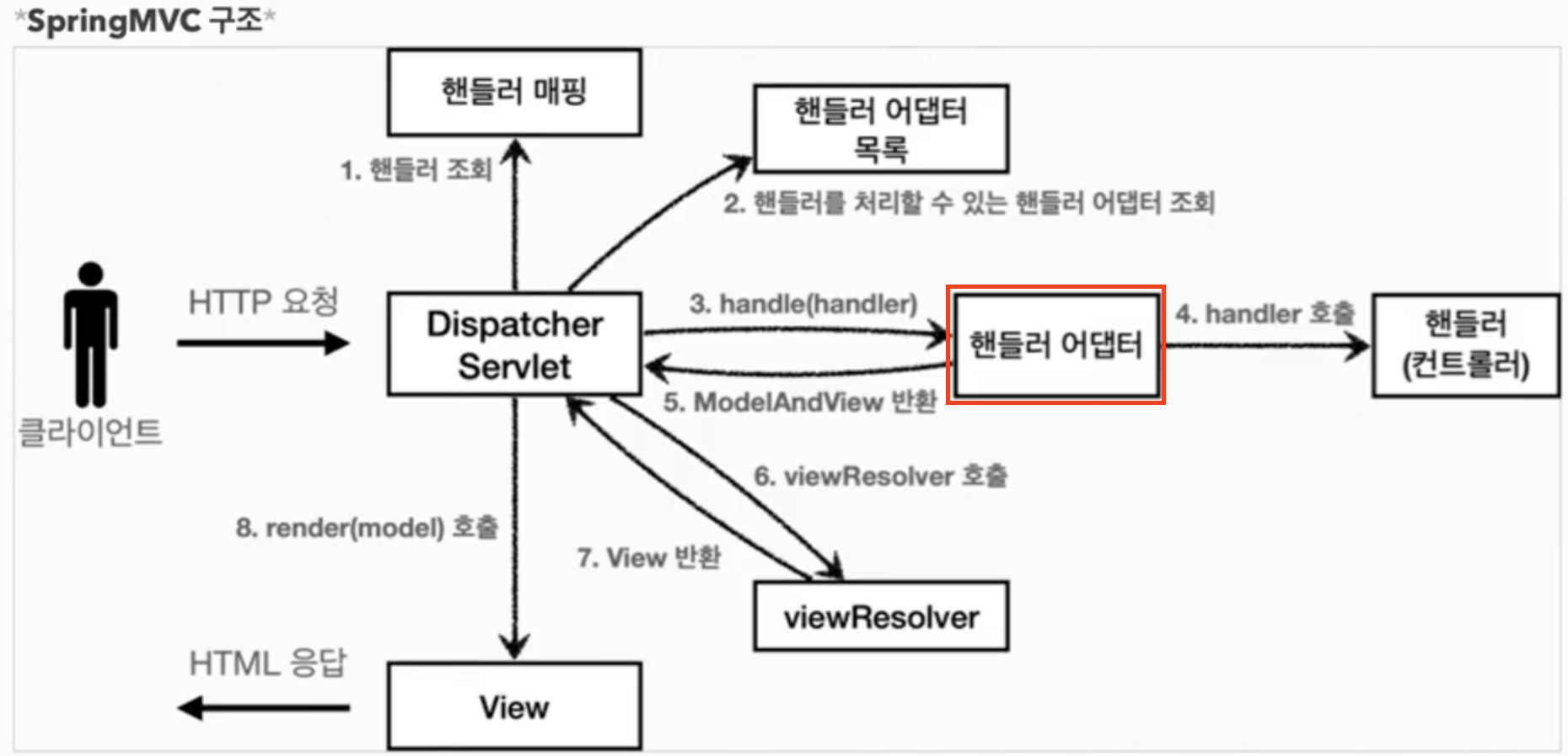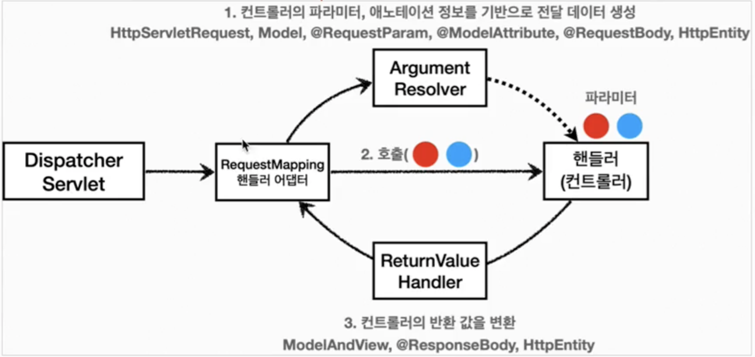 - 사용자 HTTP 요청 → DispathcerServlet → 핸들러 어댑터(RequestMappingHandlerAdapter)는 위와 같다