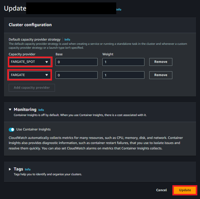 [클러스터] -> [클러스터 업데이트] 선택 -> 기본 용량 공급자 전략 FARGATE_SPOT 적용