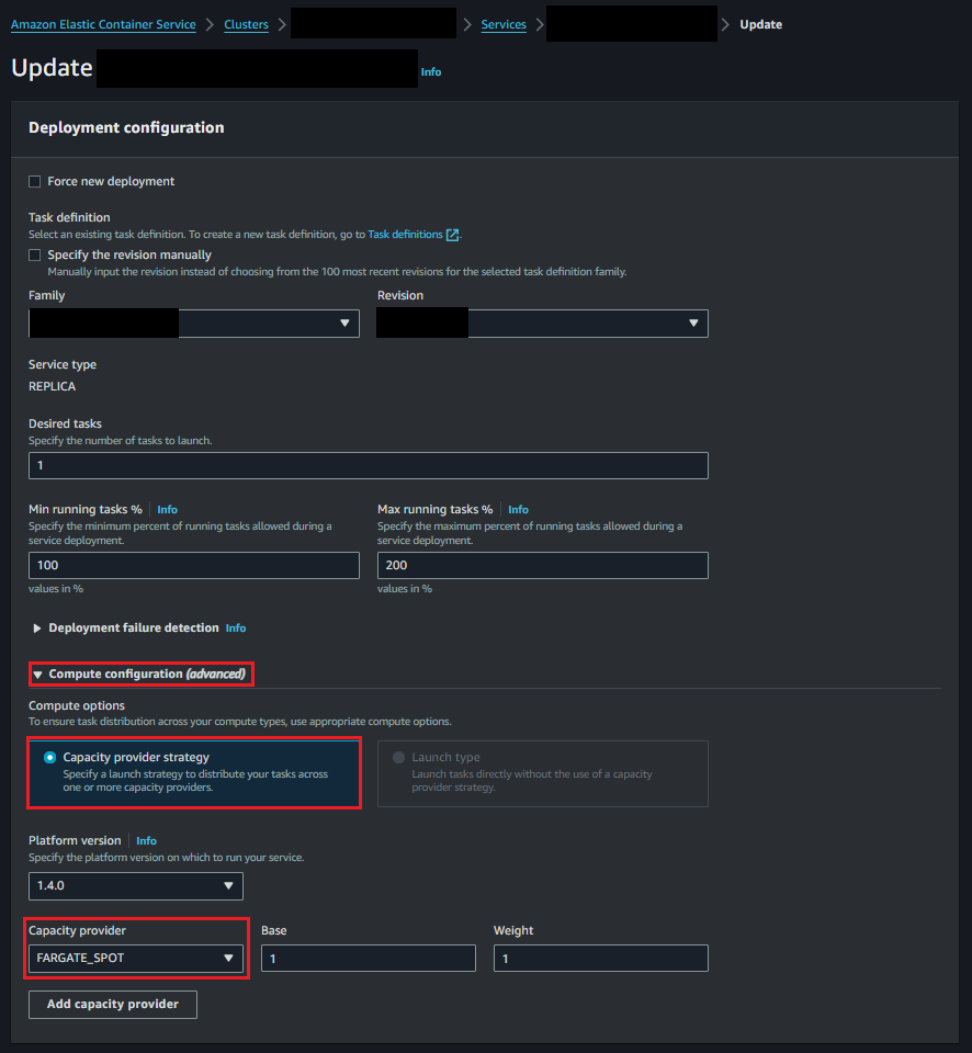 [클러스터] → [서비스] 선택 → [서비스 업데이트] 선택 → 용량 공급자 전략 FARGATE_SPOT 적용