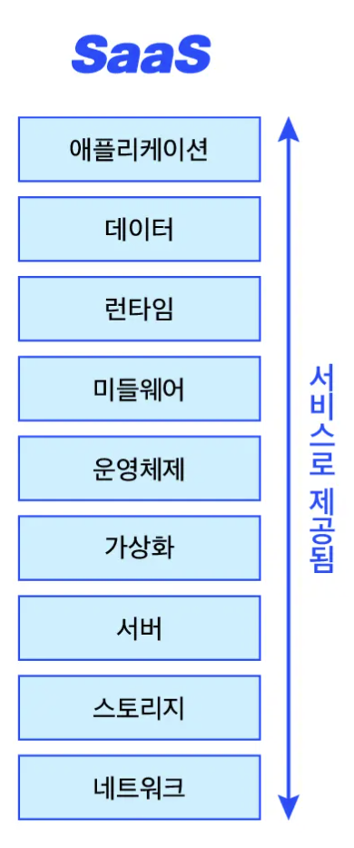 - SaaS는 클라우드 컴퓨팅의 가장 일반적인 서비스 모델이다. 사용자에게 완전한 애플리케이션을 제공한다. 또한 사용자가 애플리케이션을 실행하고 데이터를 저장할 수 있으며, 브라우저를 통해 엑세스가 가능하다. SaaS는 애플리케이션을 설치하거나 관리할 필요가 없어 매우 편리하다.