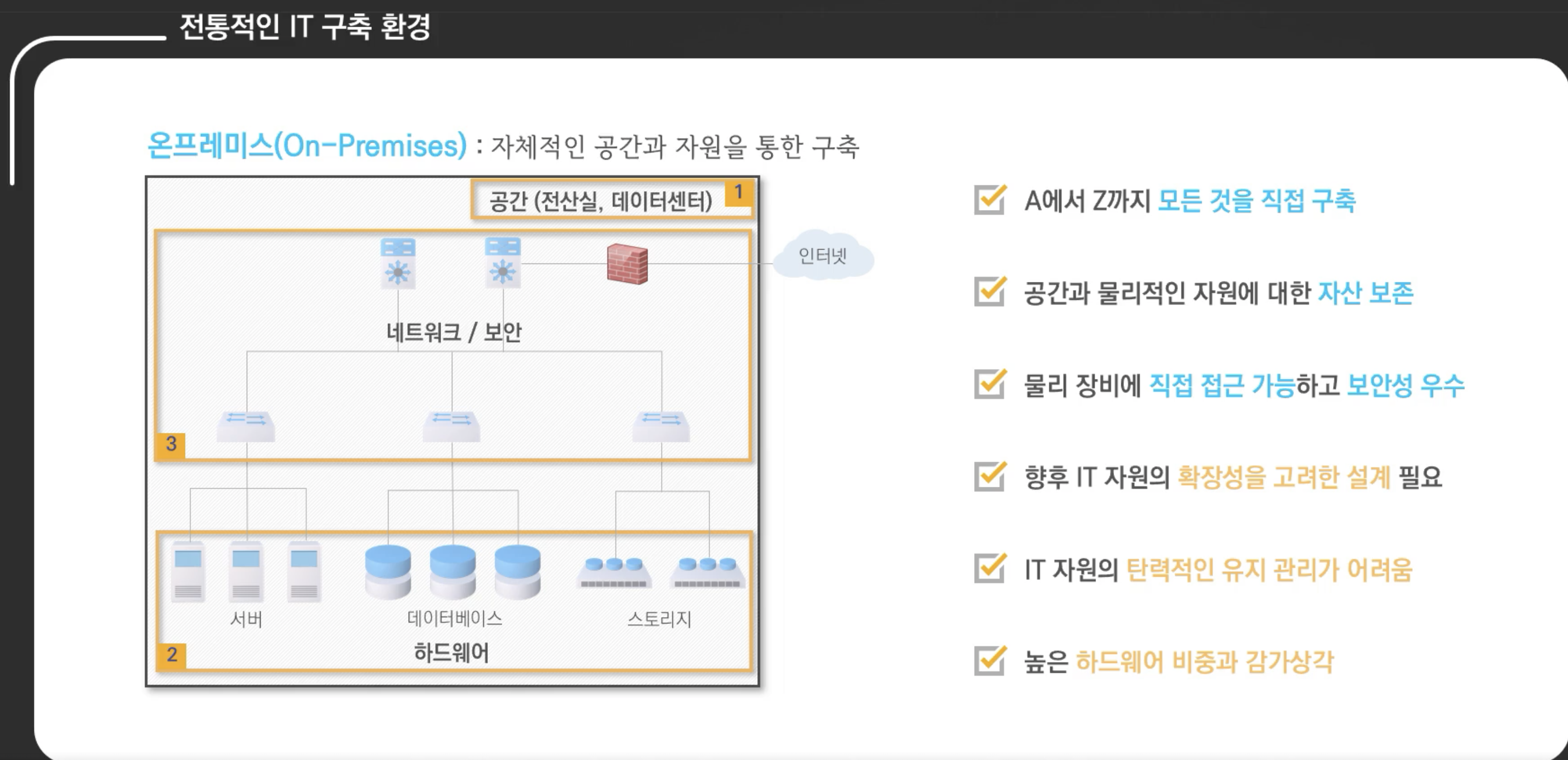 - 이렇게 자체 공간과 자원을 통해 구축하는 방식을 온프레미스라 한다