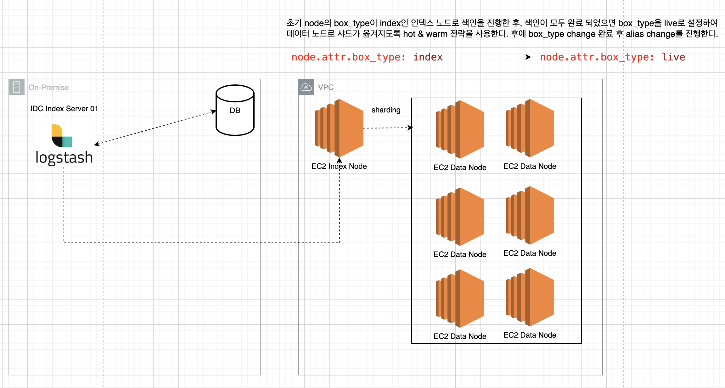 후에 풀색인이 완료되면 box_type change(hot & warm) 전략을 통해 node.attr(index : 인덱스 노드) -> node.attr(live : 라이브 서비스 데이터 노드) 샤딩을 수행한다. 이 때, 데이터 노드의 node.attr가 live로 선언이 되어 있기에 모든 샤드가 데이터 노드로 분배가 되어진다.