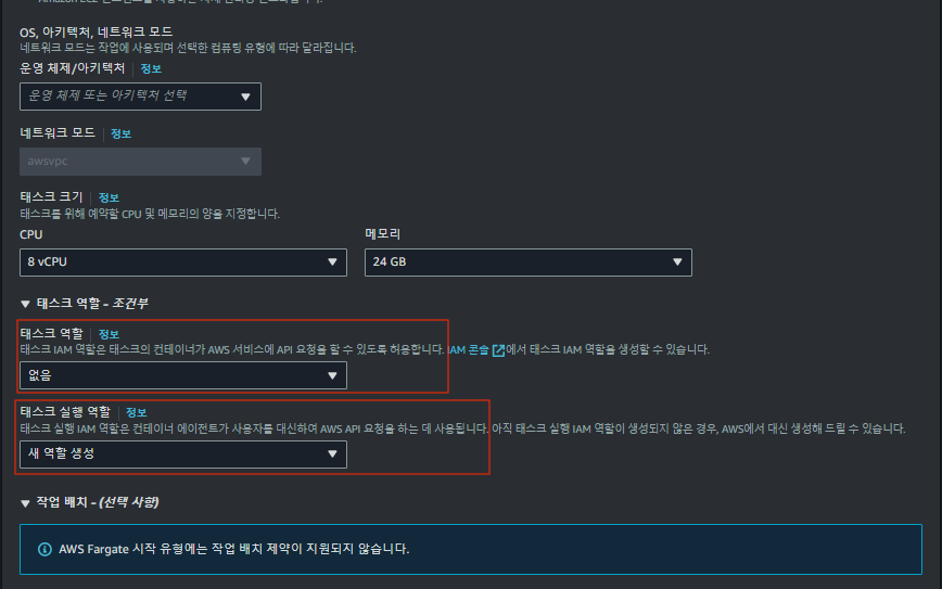 Task를 만들 때 위 사진 과 같이 Task Role과 Task Execution Role을 지정해야 한다.
