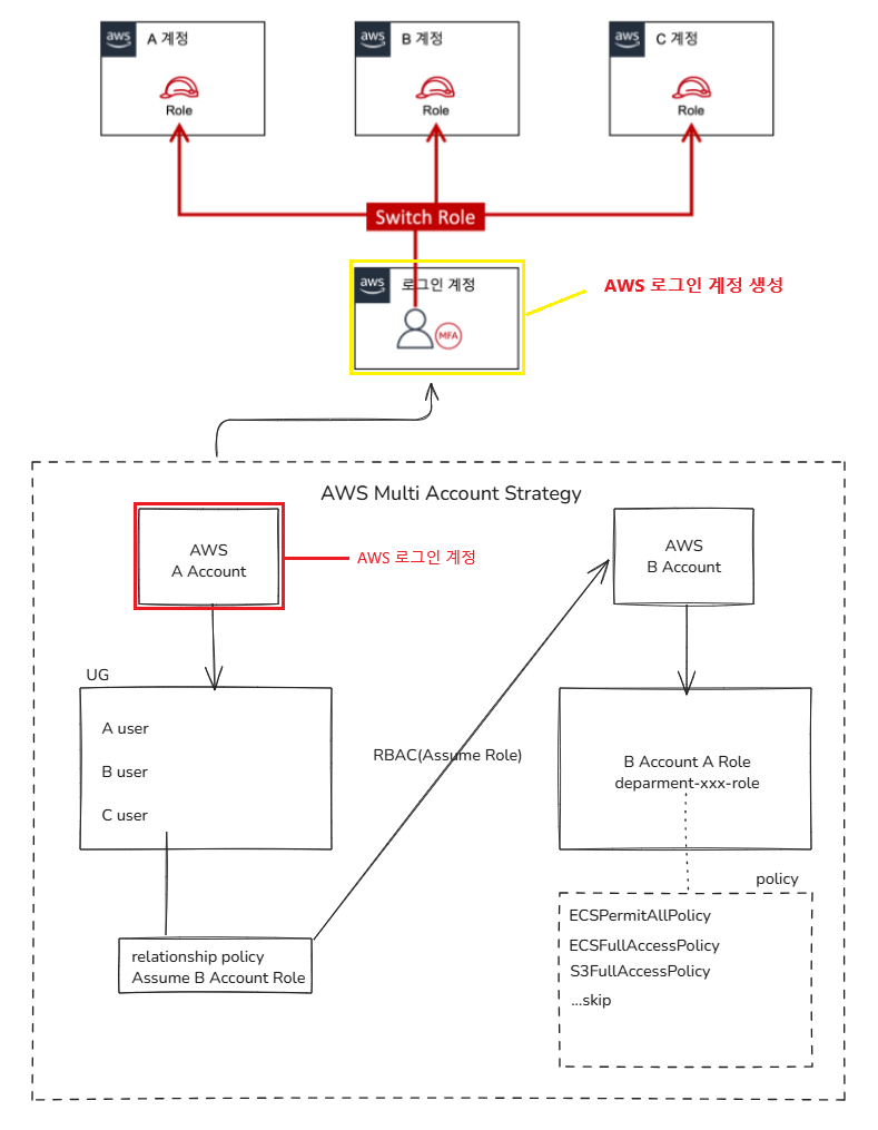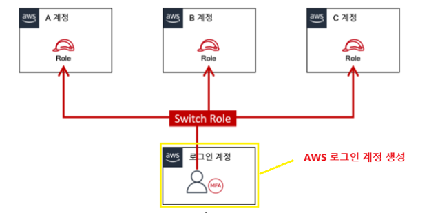 이렇게 구성 된 경우 1개의 로그인 IAM 계정에 로그인 후, 필요에 따라 다른 Account의 Role로 역할을 Assume하면 된다.