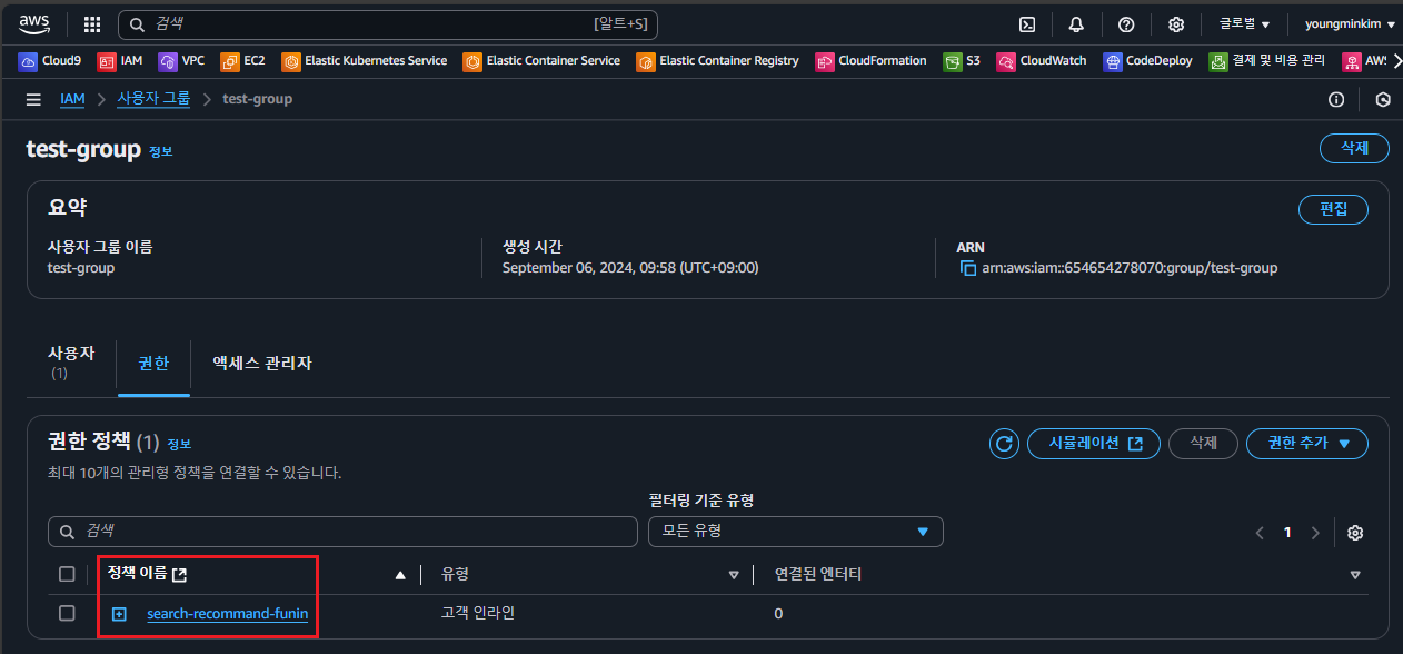 - (중요) IAM > 사용자 그룹 > test-group > 권한 Tab 클릭 > 정책(Policy) 추가 > 인라인 정책 생성
