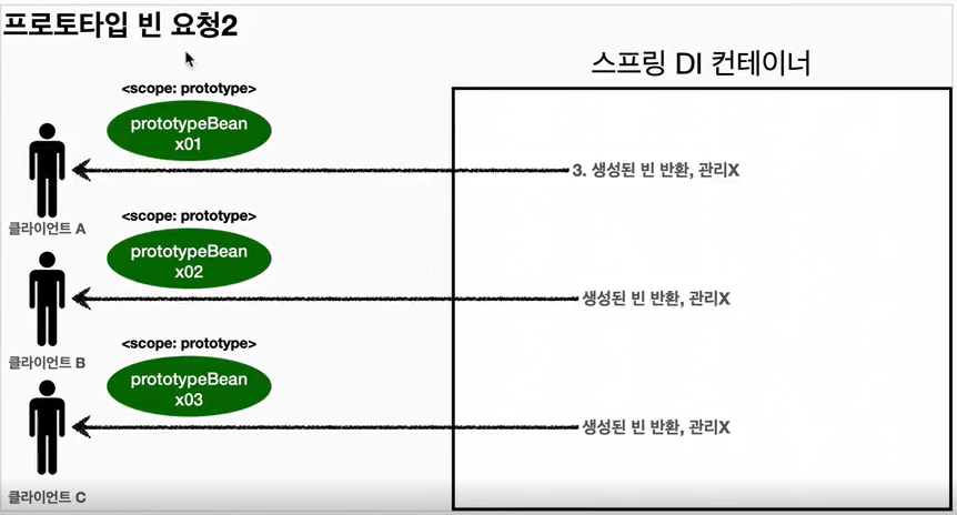 - 클라이언트 A, B, C → 프로토타입 스코프 빈 요청 → 스프링 컨테이너