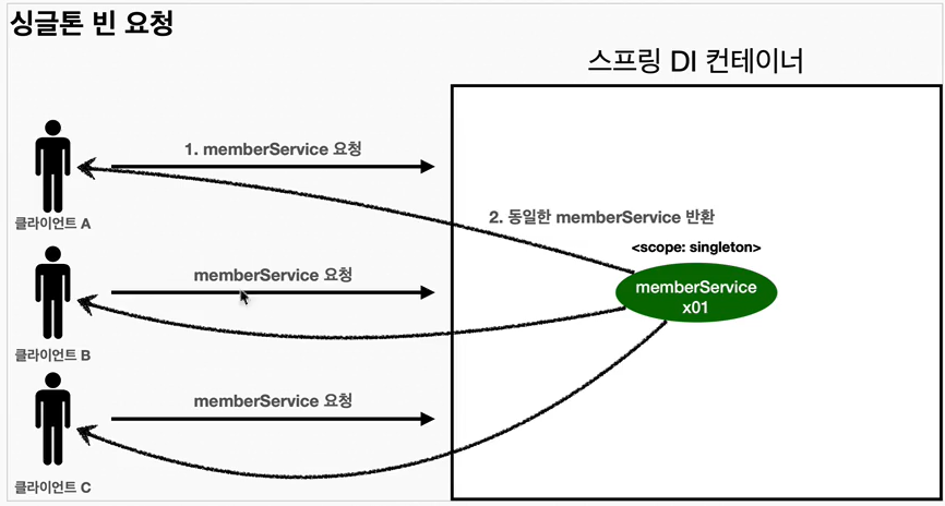 - 클라이언트 A, B, C → 싱글톤 스코프 빈 요청 → 스프링 컨테이너