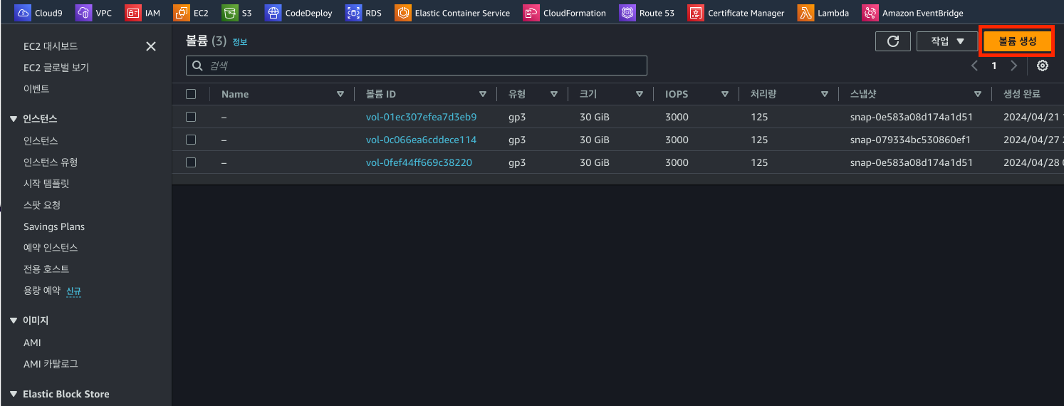 - 우선 AWS 사이트 로그인 후 볼륨 생성 클릭