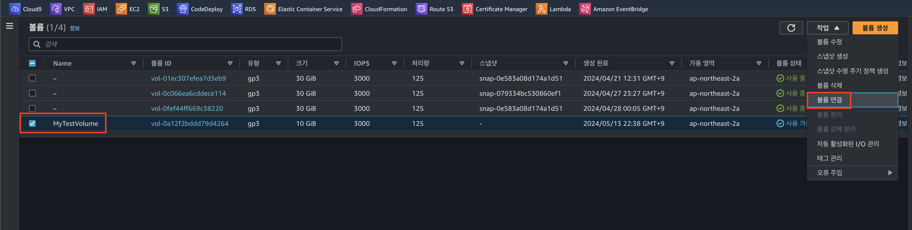 - 그러면 이제 EC2 인스턴스에 생성된 볼륨을 연결해보자