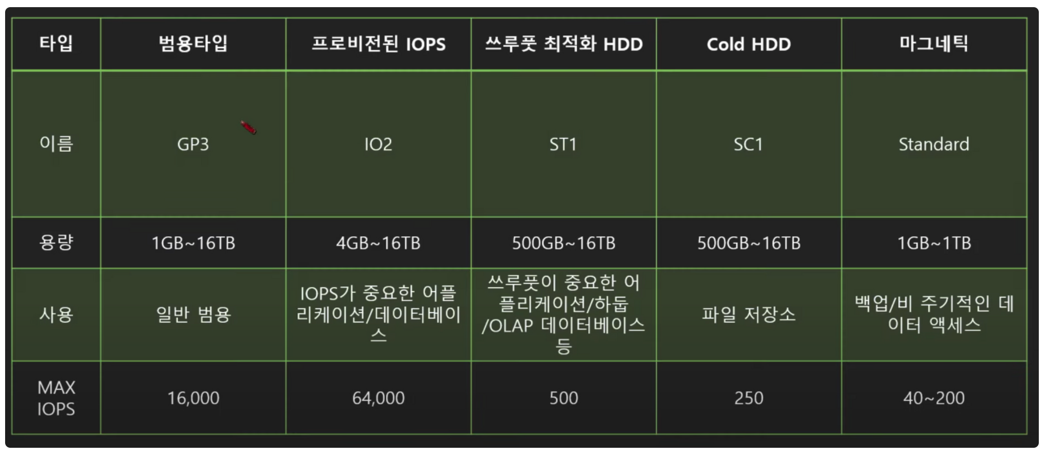 EBS 타입이란 같은 하드 저장 디스크라도 SSD, HDD, 느브메로 구분이 된다