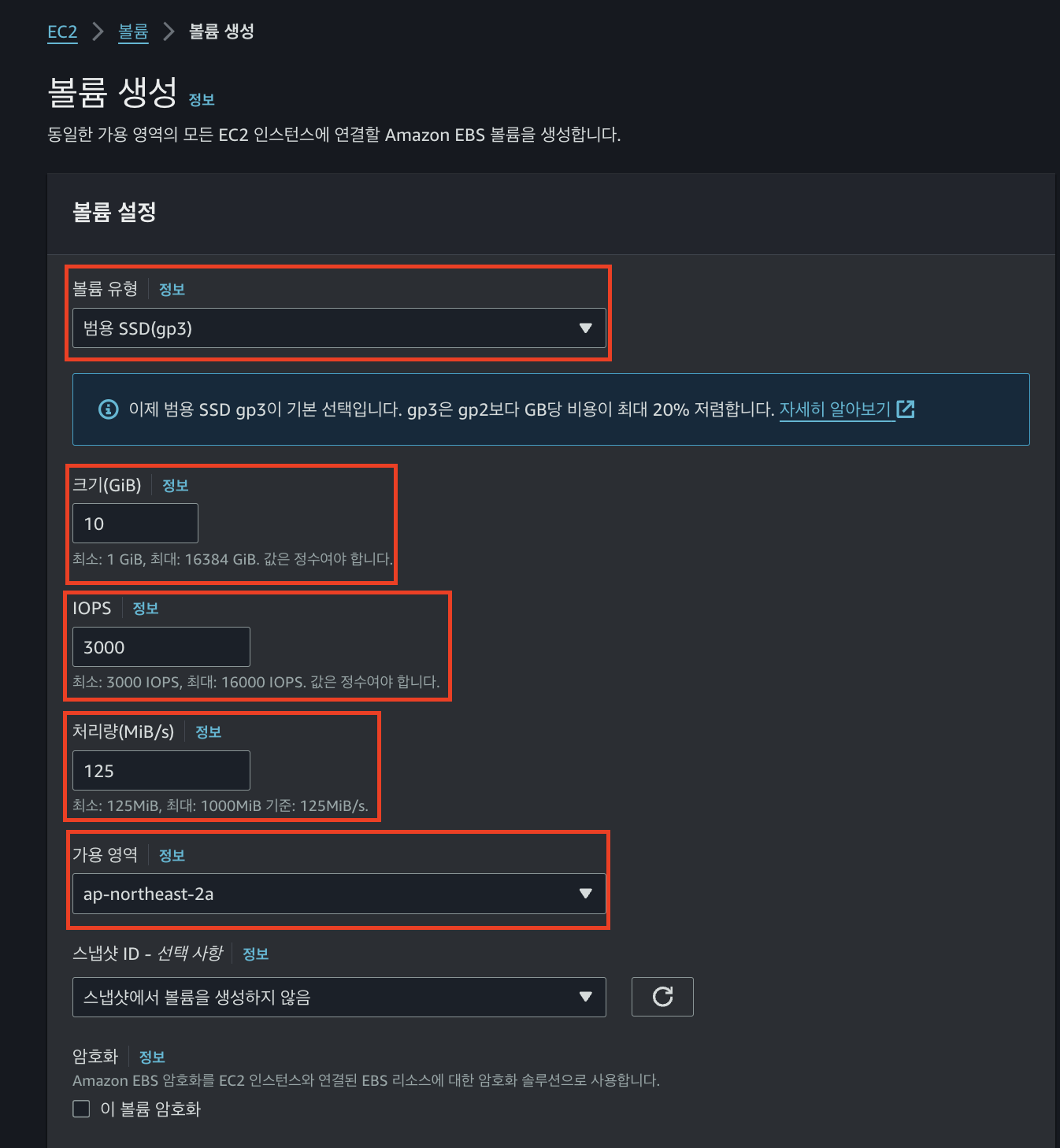 - IOPS, Throughput은 각각 3000, 125로 설정