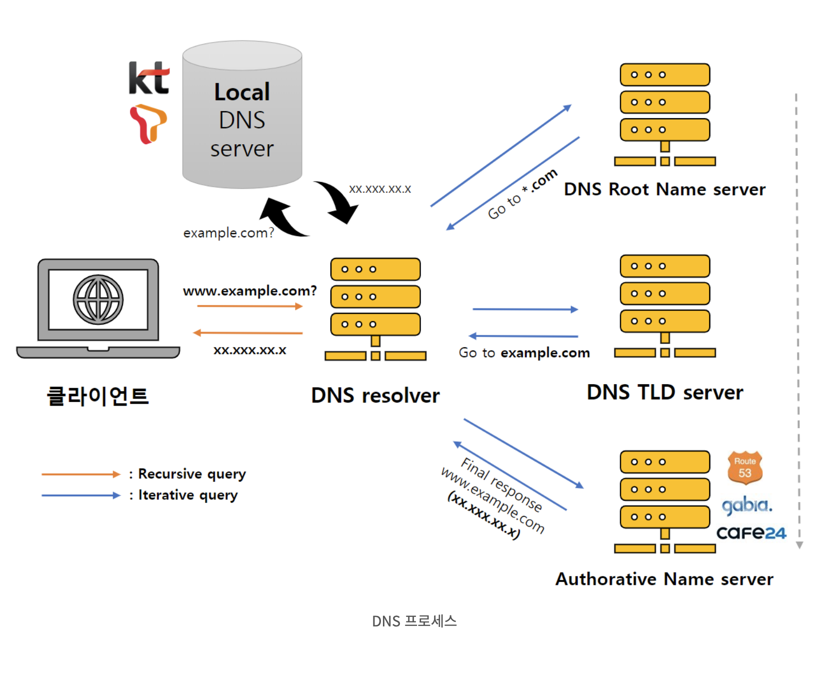 - 로컬 DNS 캐시에 IP 정보가 없으면, 클라이언트는 ISP(KT, SK, LG 등)의 재귀적 DNS 리졸버(Recursive DNS Resolver)에 요청한다