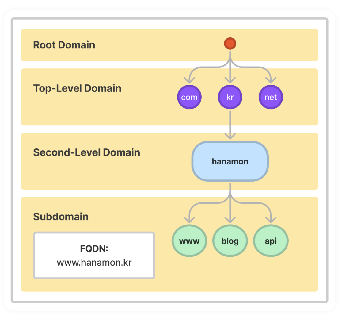 - 국가 혹은 일반 최상위 도메인(.kr, .net, .com, .org 등)