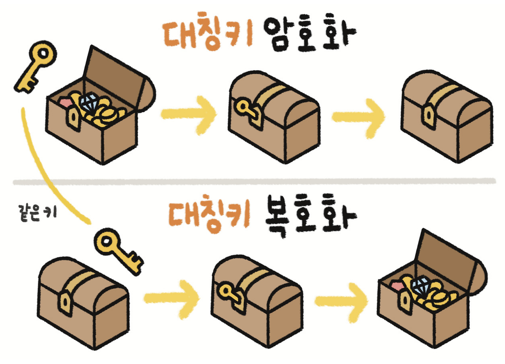 대칭키 기법은 하나의 키로 암호화, 복호화를 모두 수행하는 암호화 기법이다. 예를 들어, 하나의 키로 금고를 열고 잠그는 것과 비슷하다. 웹 통신에서는 클라이언트와 서버가 동일한 키(ex: 1234)를 공유하여 데이터를 암호화하고 복호화 하는 과정을 거친다. 대칭키 기법은 속도가 빠르다는 장점이 있지만, 같은 키를 공유해야 하기 때문에, 전송 중 키가 탈취될 위험이 존재한다.