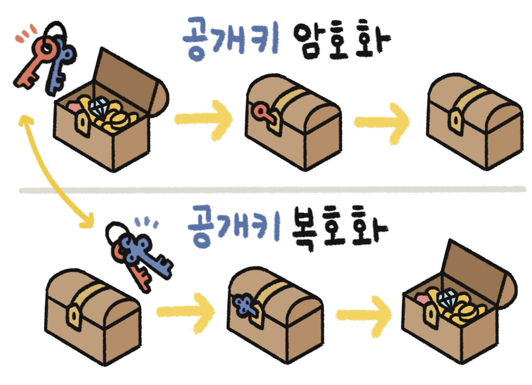 중요한 부분은 공개키 기법은 서로 다른 두개의 열쇠(ex: 빨간키, 파란키)로 구성되며, 하나로 잠그만 반드시 다른 하나로만 열수가 있다. 즉, 서버가 개인키를 보유하고 클라이언트에게 공개키를 전달하면, 누군가 공개키를 탈취하여도 개인 없이는 복호화가 불가능하기에 안전하게 보호할 수 있다. 하지만, 비대칭키 방식은 안전하게 데이터를 주고 받을 수 있지만, 암호화 과정이 복잡하기에 속도가 느리다는 단점이 존재한다.