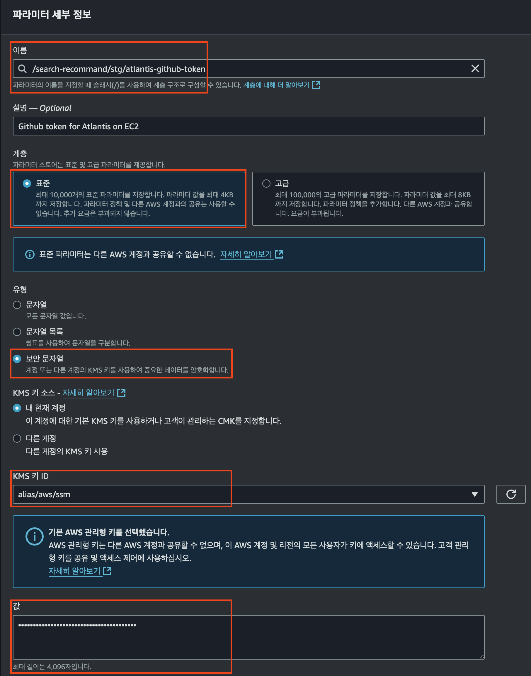 - 값(Value): 저장할 실제 값, SecureString의 경우 마스킹되어 저장 후 보이지 않음