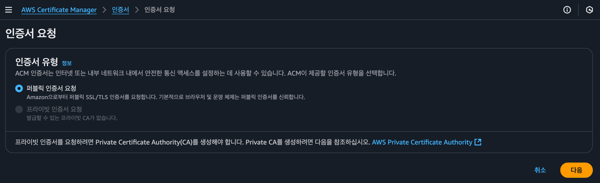 인증서 요청 버튼을 클릭하면 위와 같이 인증서 유형을 지정하는 화면이 출력된다. 여기서는 옵션 변경없이 퍼블릭 인증서 요청이 선택된 채로 두고 다음 버튼을 클릭한다.