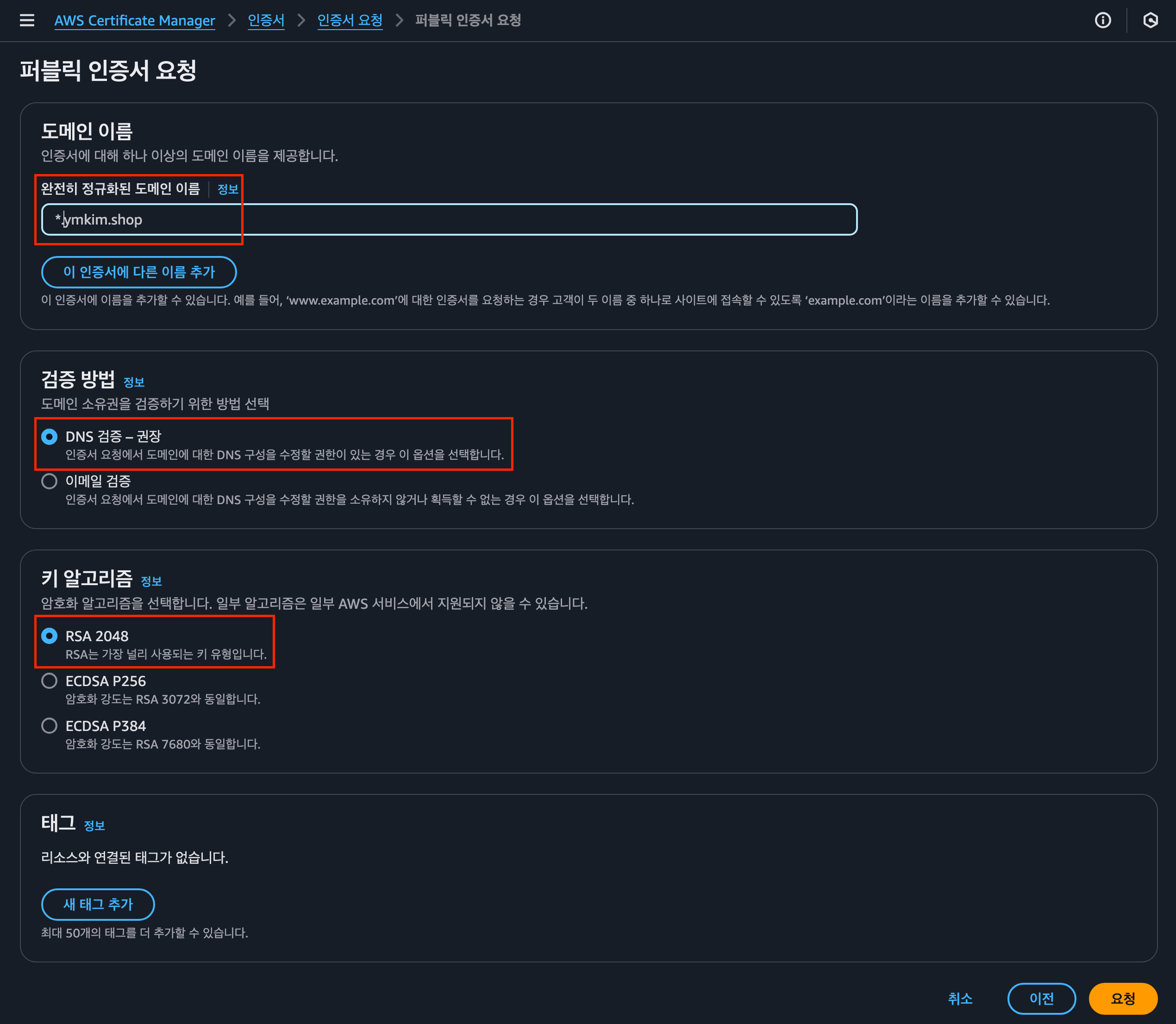 필자의 경우, 이전에 가비아에서 ymkim.shop 이라는 도메인을 구입하였다. 이제 해당 도메인을 기반으로 ACM을 생성할 예정이다. 우선, 위 화면에 있는 인증서 요청이라는 버튼을 클릭한다.