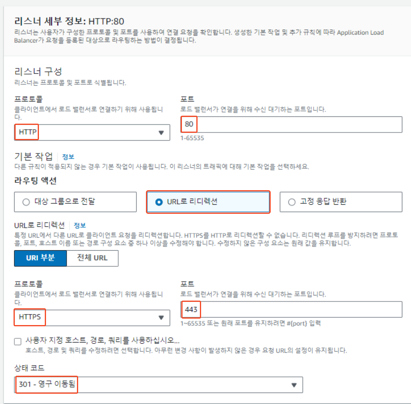 이제 ALB의 80 리스너를 추가한 후에, HTTP 80로 요청이 들어오는 경우는 HTTPS 443로 리다이렉션을 수행하도록 수정한다. 이렇게 설정하면, HTTPS 이외의 요청에 대해서는 모두 Redirection을 수행할 것이다.