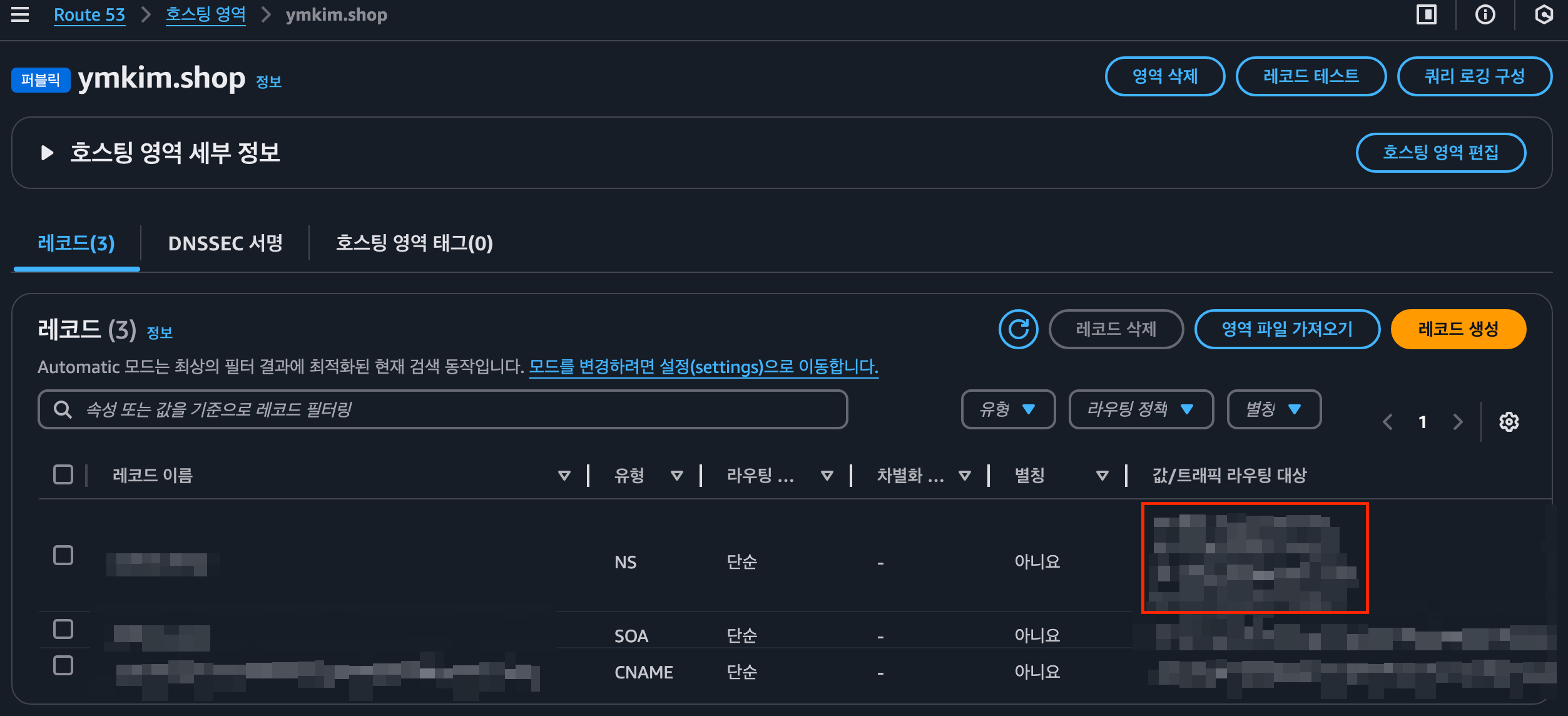 버튼을 클릭하면 도메인과 검증 상태가 표시되며, 레코드 생성을 진행할 수 있다. 하지만 현재 Route53에 호스팅 영역이 없고 외부 도메인을 사용 중이므로, 먼저 Route53에 호스팅 영역을 생성해야 한다. 생성이 완료되면, ACM이 요구하는 CNAME 레코드를 Route53에 추가하고, 가비아에서는 네임서버(NS) 정보를 Route53의 NS 값으로 변경해야 한다.