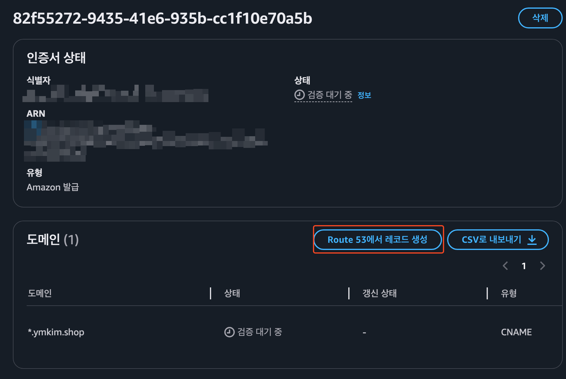 요청 버튼을 클릭하면 인증서가 생성되고, 검증 단계가 진행된다. 이후 Route53에서 레코드를 생성해야 한다. 앞서 언급했듯, 필자는 ACM 인증서를 생성한 뒤 DNS를 통한 검증 방식을 선택했다. 따라서 Route53에서 해당 도메인에 TXT 레코드를 추가하고, 이를 통해 AWS가 도메인 소유권을 검증하도록 진행할 예정이다.