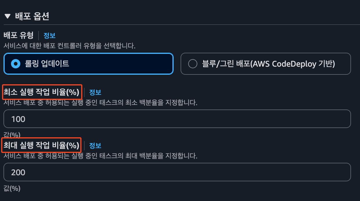⚠️ 최소 정상 유지 Task 수 = desiredCount x (minimumHealthyPercent / 100)
