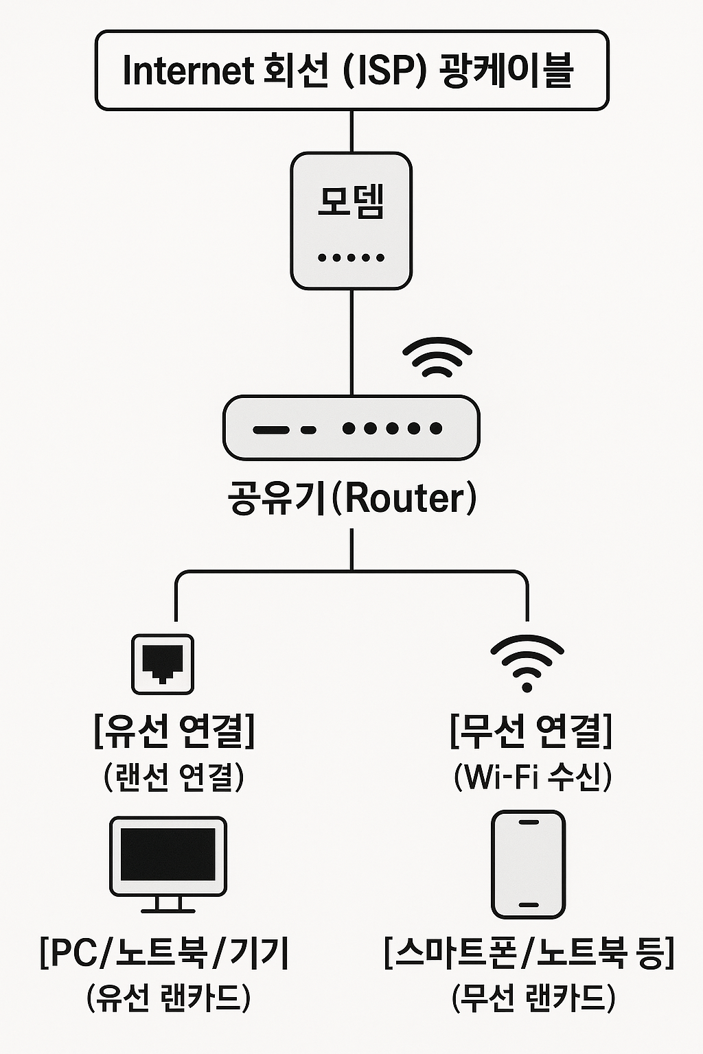 [내부 기기] → [192.168.0.1 (공유기 + 내부 게이트웨이)] → [NAT 변환] → [공인 IP로 외부 인터넷]
