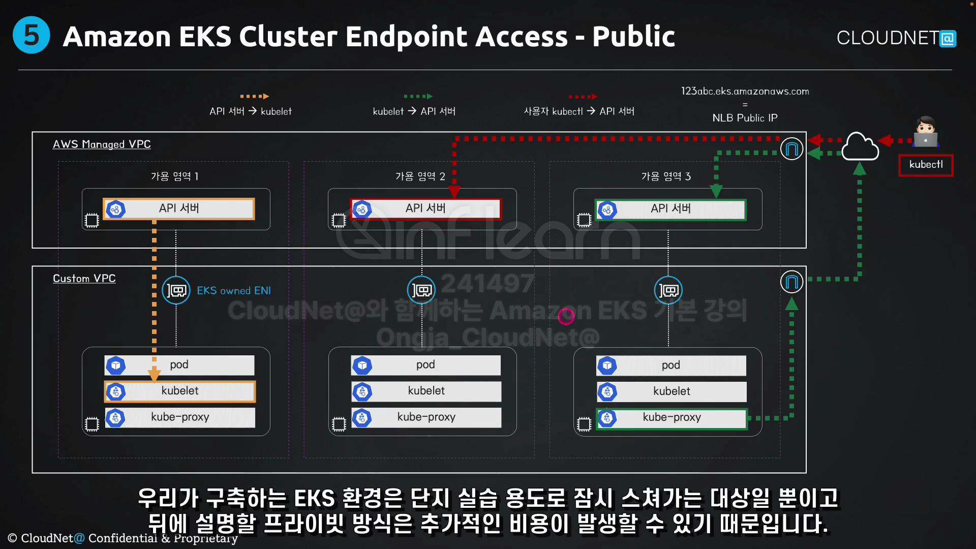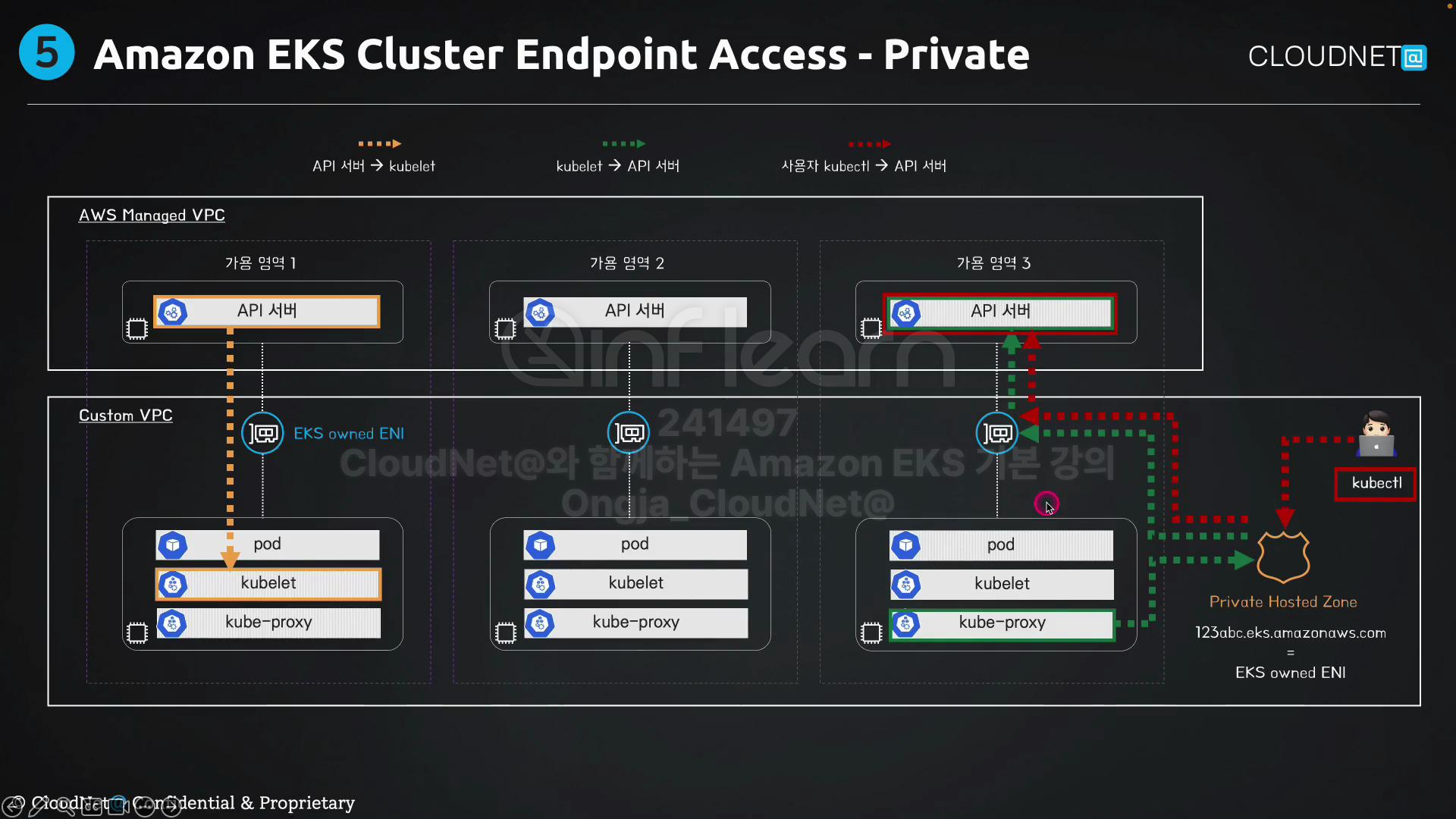 사용자가 kubectl 요청하면, 프라이빗 호스팅을 통해 EKS owned ENI로 API Server에 연결된다.