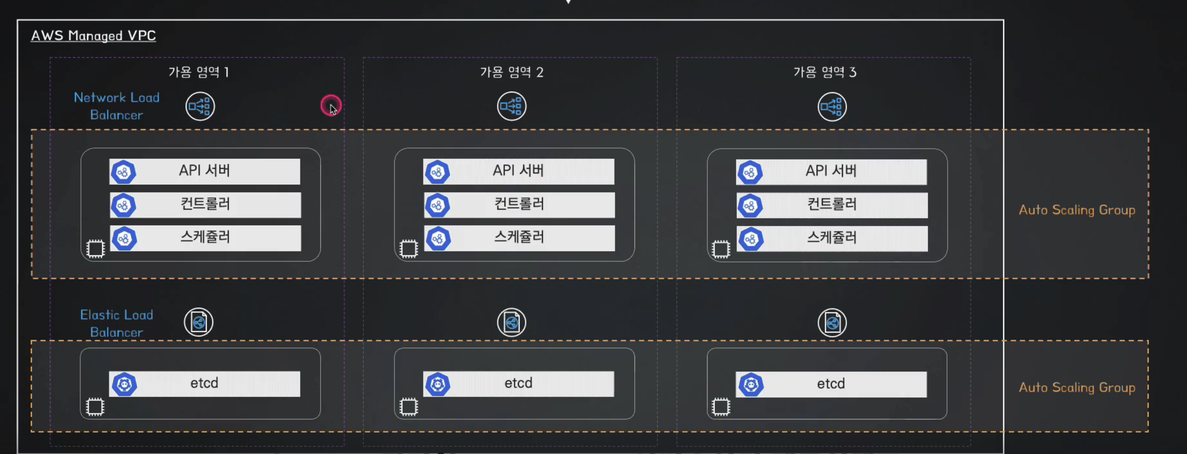 그리고 이렇게 구성된 여러 자원들은 Auto Scaling을 통해 안정적인 상태를 유지하게 설정되어 있다. 또한, 여러 가용영역(AZ)에 자원이 분산되어 있기에 NLB(Network Load Balancer)를 사용하여 트래픽을 효율적으로 분산한다. etcd는 Client‑Side Load Balancing을 사용하며, API Server가 etcd와 직접 통신하는 구조로 바뀌었다. (API Server → Client Side LB → etcd)