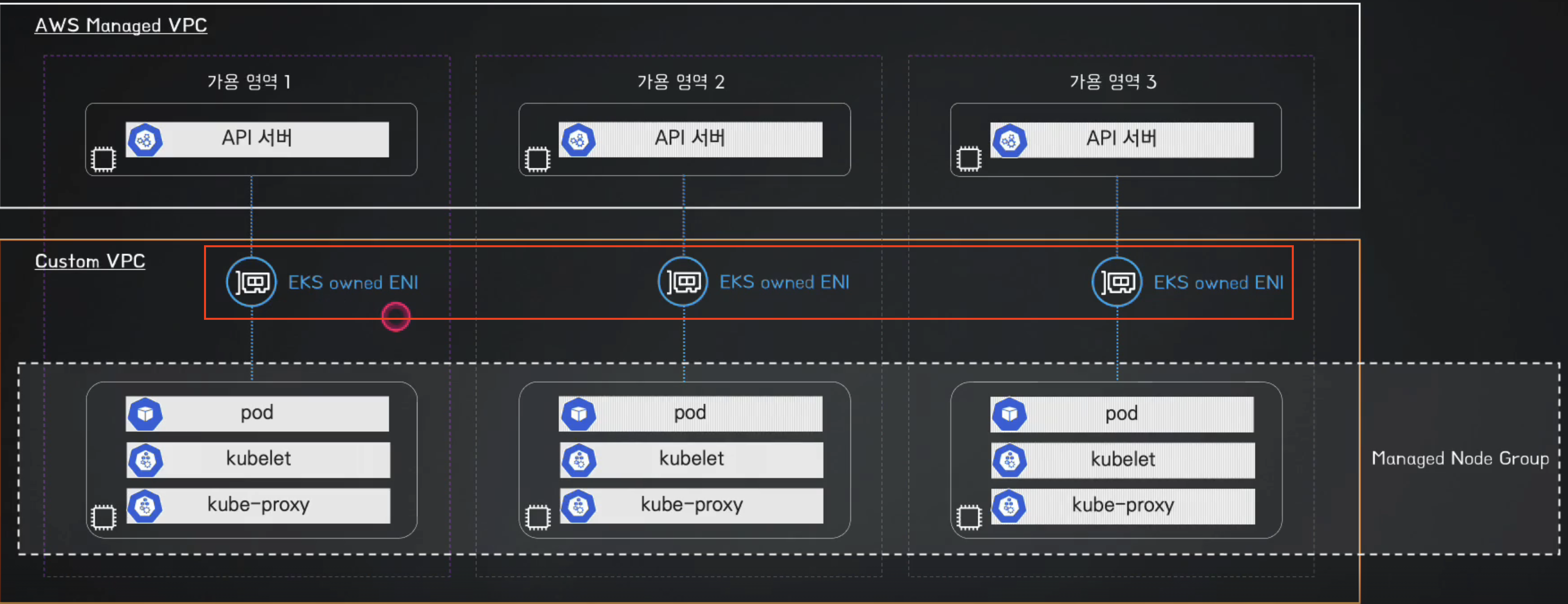 Data Plane은 Kubernetes 워커 노드가 배치되는 영역으로, 이곳에 kubelet, kube‑proxy, 컨테이너 런타임, Pod가 위치한다. 또한, Control Plane과 달리 Data Plane은 사용자 VPC에 배치되므로, 사용자가 직접 VPC와 네트워크를 제어할 수 있다. 위 이미지를 보면 AWS 관리형 VPC의 여러 가용 영역(AZ)에 Control Plane이 구성되어 있다. 워커 노드의 kubelet이 Control Plane의 API Server와 통신하려면 양쪽을 연결해야 하며, 이를 위해 EKS Owned ENI가 사용된다. 결론적으로, Control Plane과 Data Plane은 EKS Owned ENI를 통해 안정적으로 연결된다.