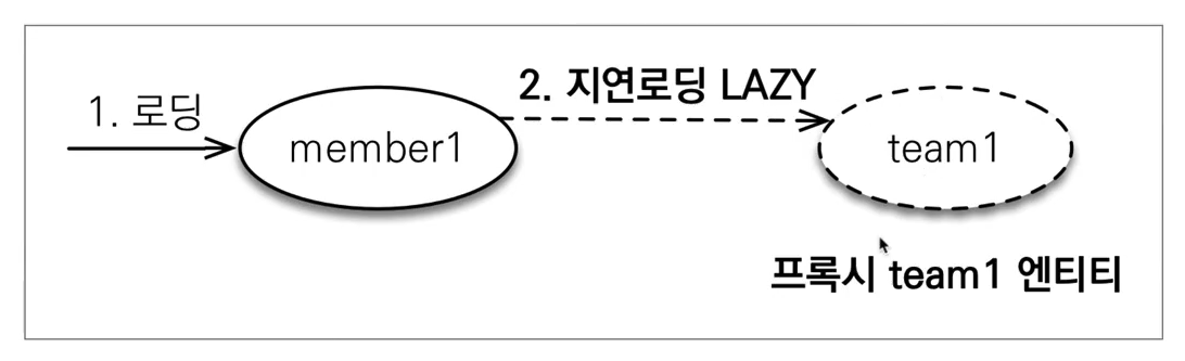 member1을 로딩할 때 team1 엔티티는 지연 로딩으로 셋팅되어 프록시 객체 반환.