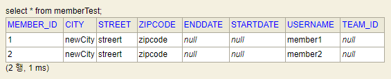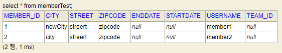 위와 같이 member, member2의 값은 영속화 시킨 후 member 참조변수를 통해 City의 값을 변경하였다. 다음 사진을 살펴보자.