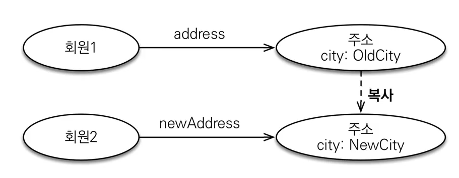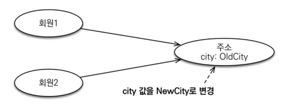 - 임베디드 타입 같은 값 타입을 여러 엔티티에서 공유하면 상당히 위험하다.