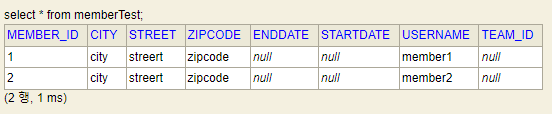 위 코드를 실행하면 member, member2 객체를 통해 INSERT 쿼리가 2번 발생된다. 또한 Address 객체를 인수값으로 넣어줬기 때문에 결과값은 다음과 같다.