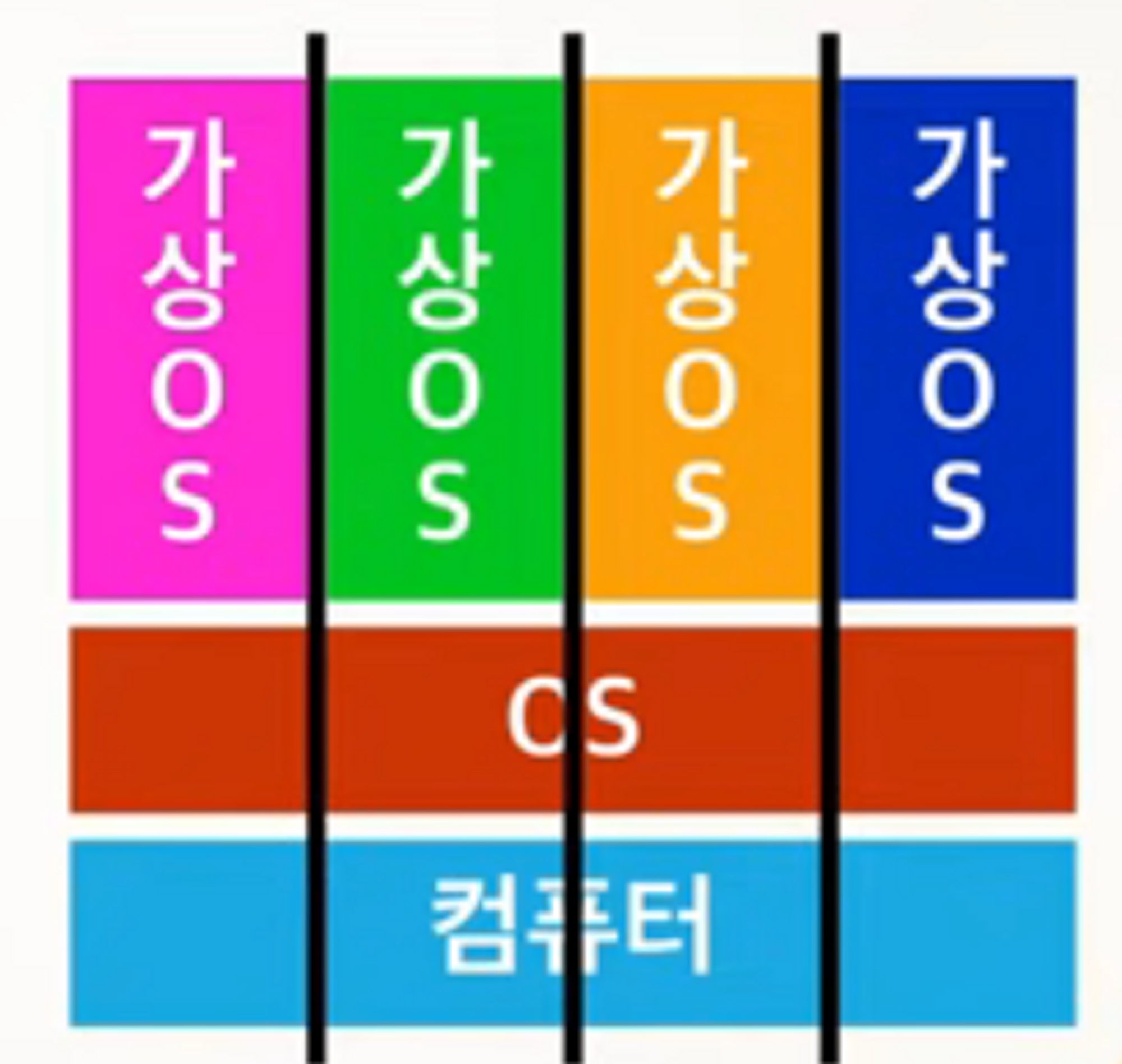 가상 컴퓨팅(VMware, VirtualBox)은 한 물리적 컴퓨터 안에 각각 OS를 돌리는 컴퓨터들이 물리적 자원을 분리해서 사용하기에 메모리를 더 많이 잡아먹어서 성능에 한계가 생김.