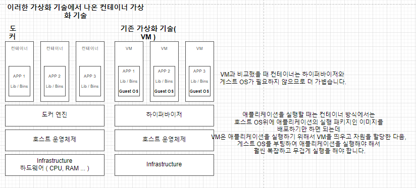 - 가상화 기술의 하나지만 기존 방식과는 차이가 있음