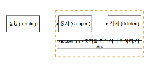 Docker Container 삭제를 위한 CMD는 위와 같다 또한 실행중인 컨테이너는 먼저 중지한 후에 삭제가 가능하다.