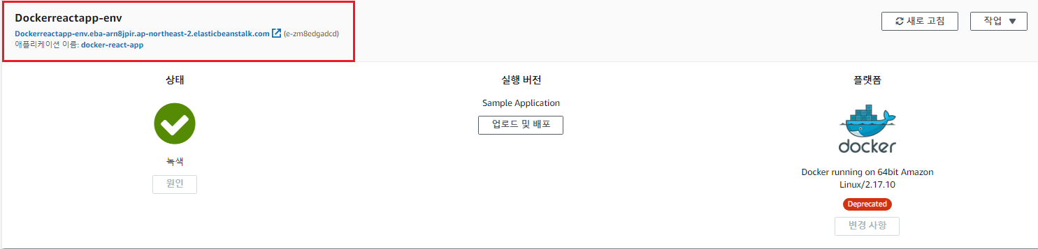 빌드가 완료되고 AWS의 Elastic Bean Stalk 페이지에 접속한 화면이다.