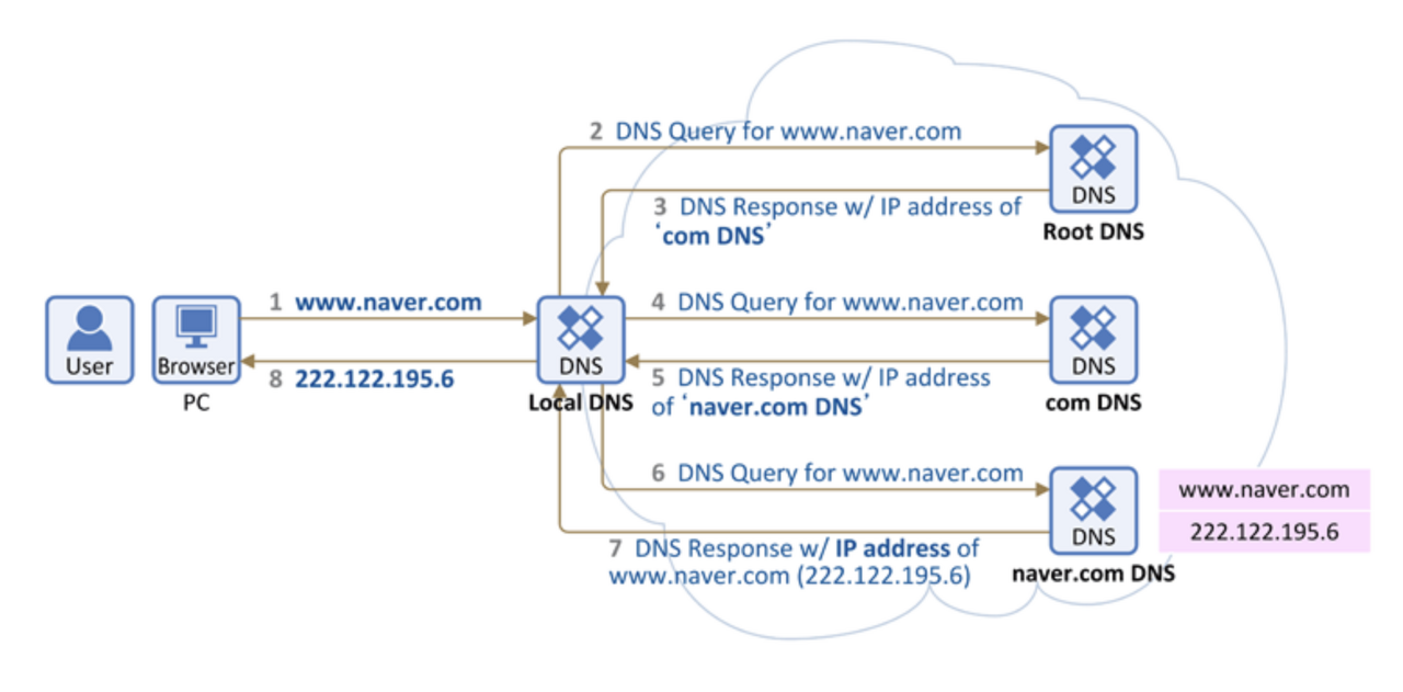 - 로컬 DNS가 여러 DNS 서버를 차례대로 질의하여 답을 찾아가는 과정