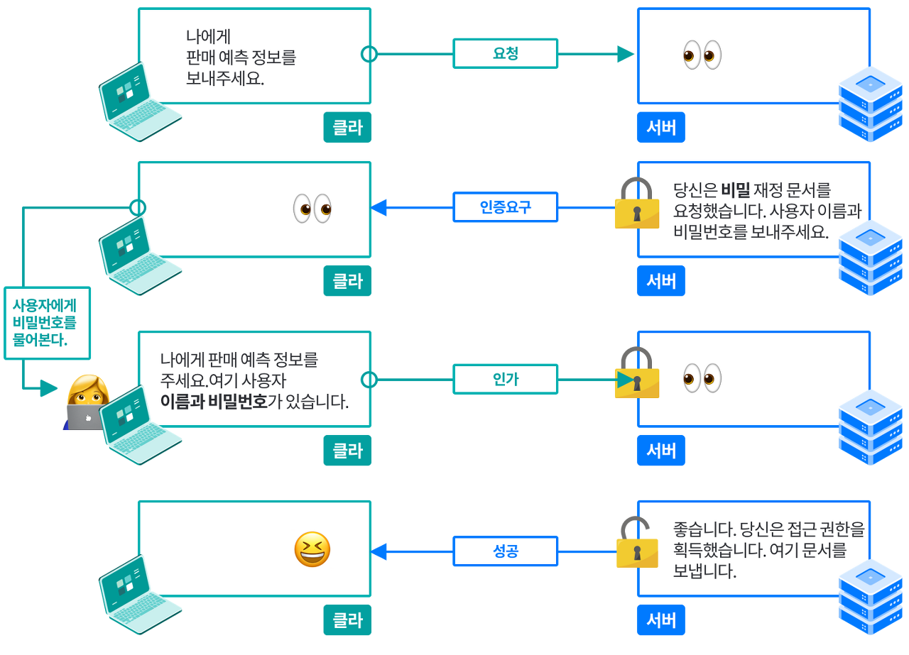 - 기본 인증의 경우 서버는 클라이언트의 요청을 거부하고 추가적인 데이터를 요구할 수 있다